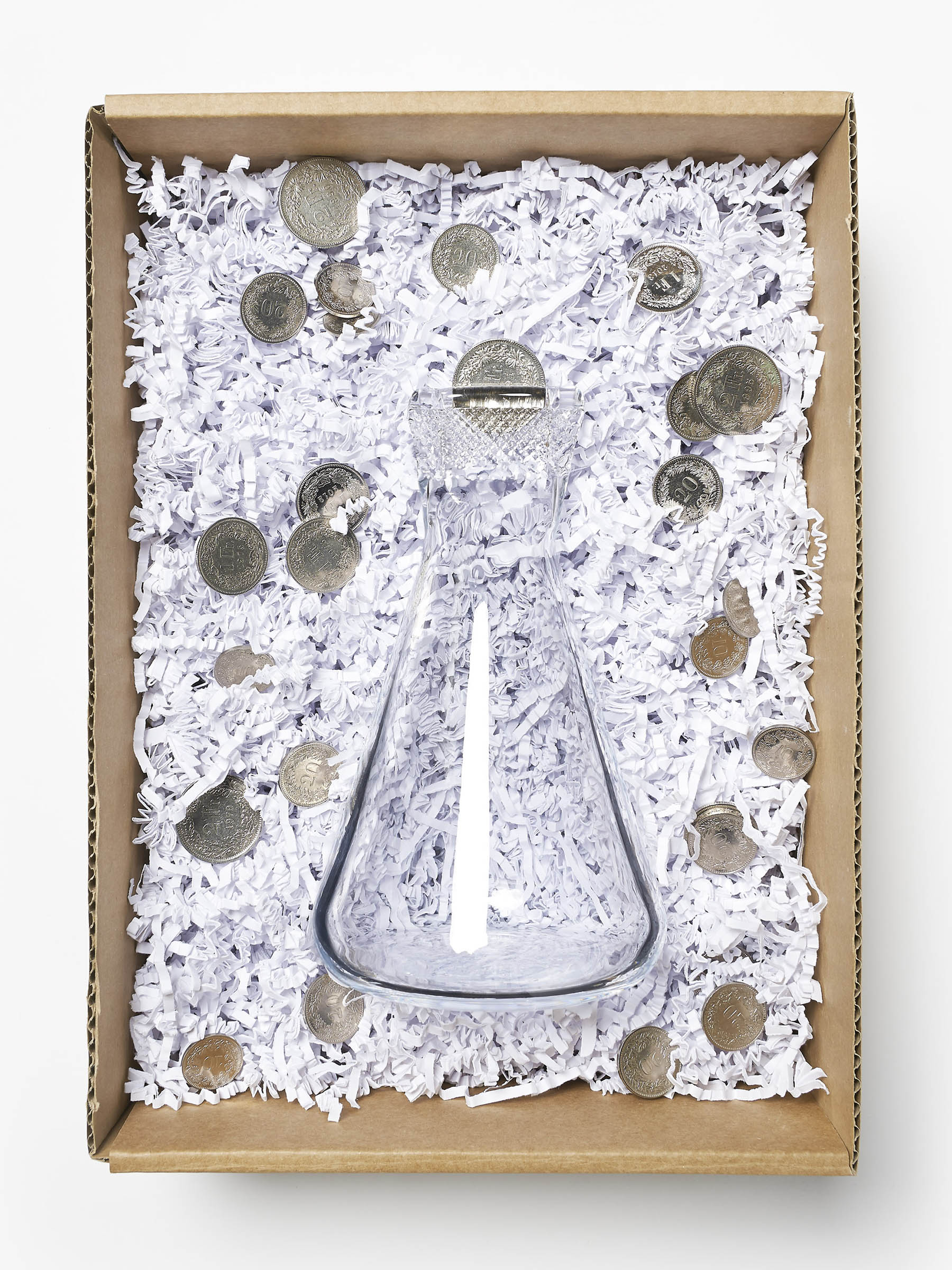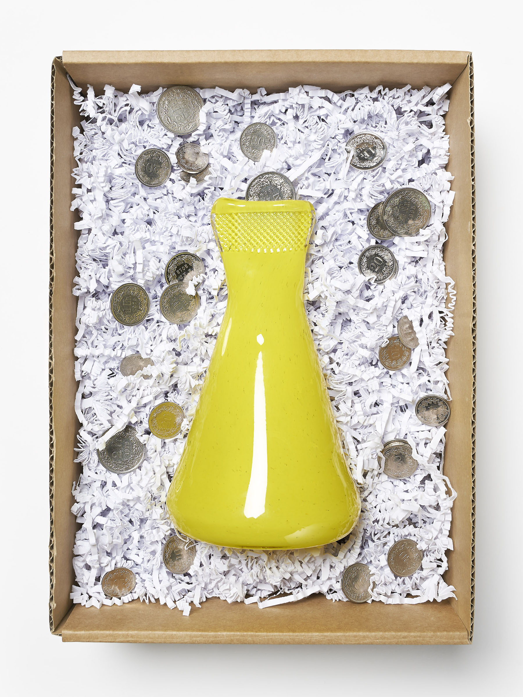 The idea behind BLING was to minimize to the fullest the steps needed to hand make a money box, in order for it to remain inexpensive. The money box is blown in a mould, then pinched while still hot with a specially designed plier in one quick gesture and set directly in the lehr where it will slowly cool down until the next day. Once it is taken out, it does not require any other manipulation and can go straight onto the shop shelves.